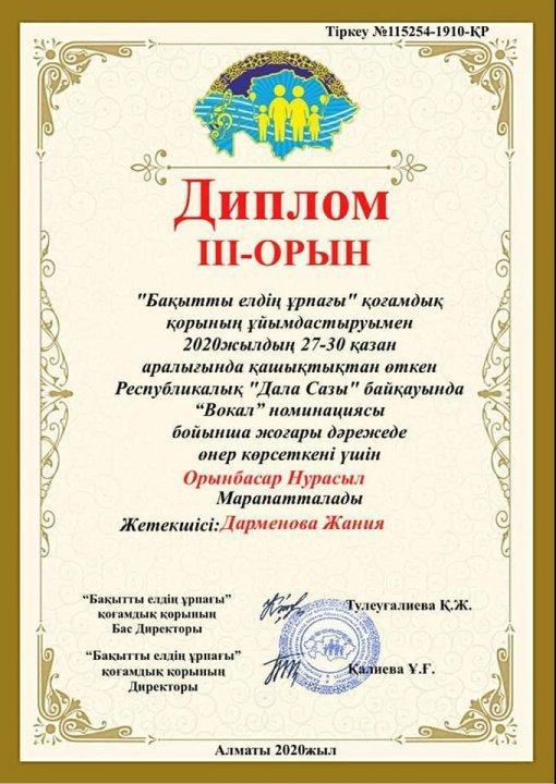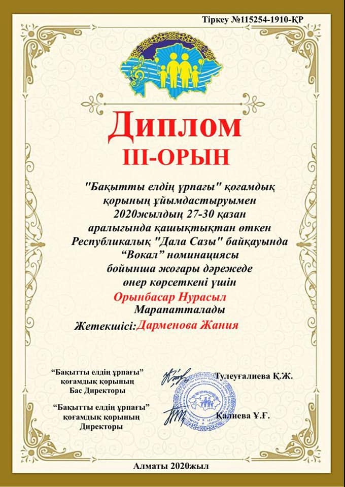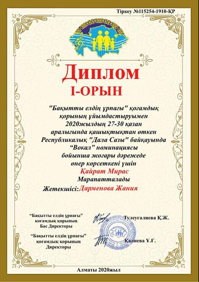 "Бақытты елдің ұрпағы" қоғамдық қорының ұйымдастыруымен 2020 жылдың 27-30 қазан аралығында қашықтықтан өткен Республикалық "Дала сазы" байқауында "Вокал" номинациясы бойынша жоғары дәрежеде өнер көрсеткені үшін #30мектеп-гимназия оқушылары Алпысбай Гүлсезім, Қайрат Мирас және Орынбасар Нұрасыл 1 және 3 орын дипломдарымен марапатталды. Жетекшісі Дарменова Жания. Құттықтаймыз!!!