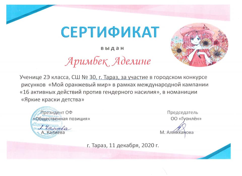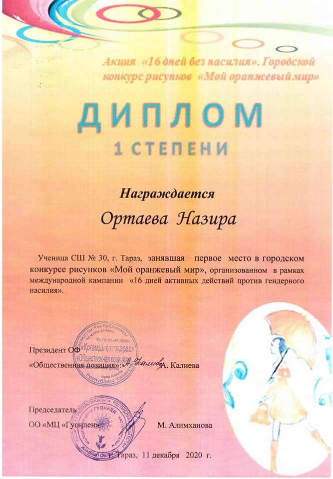 «Общественная позиция» қоғамдық қоры мен жастар орталығы «Гуонлен» қоғамдық бірлестігі ағымдағы жылдың 3-8 желтоқсан аралығында «Менің сарғыш әлемім!» («Мой оранжевый мир!») атты қалалық сурет байқауын ұйымдастырды.