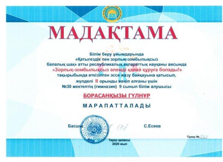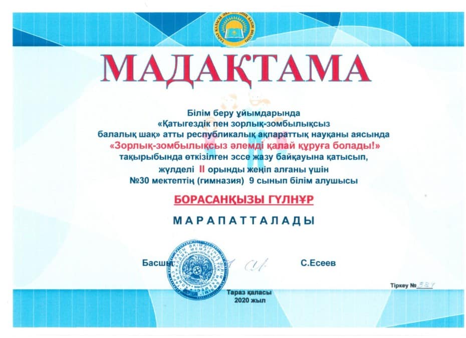 Білім беру ұйымдарында "Қатыгездік пен зорлық-зомбылықсыз балалық шақ" атты республикалық ақпараттық науқаны аясында " Зорлық-зомбылықсыз әлемді қалай құруға болады!" тақырыбында өткізілген эссе жазу байқауына қатысып, жүлделі ІІ орынды жеңіп алғаны үшін № 30 мектеп-гимназиясының 9 сынып оқушысы Борасанқызы Гүлнұр марапатталды. Жеңісті күндеріңіз көп болсын! Қуаныштымыз!
