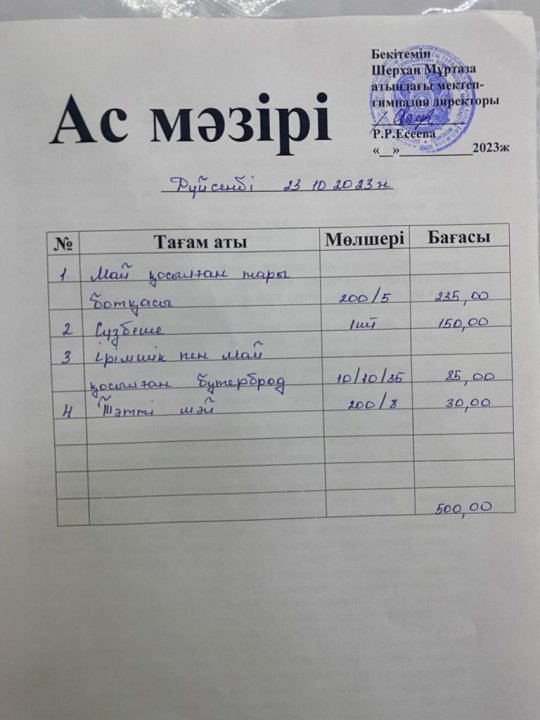 Мектеп меню 23-27 қазан