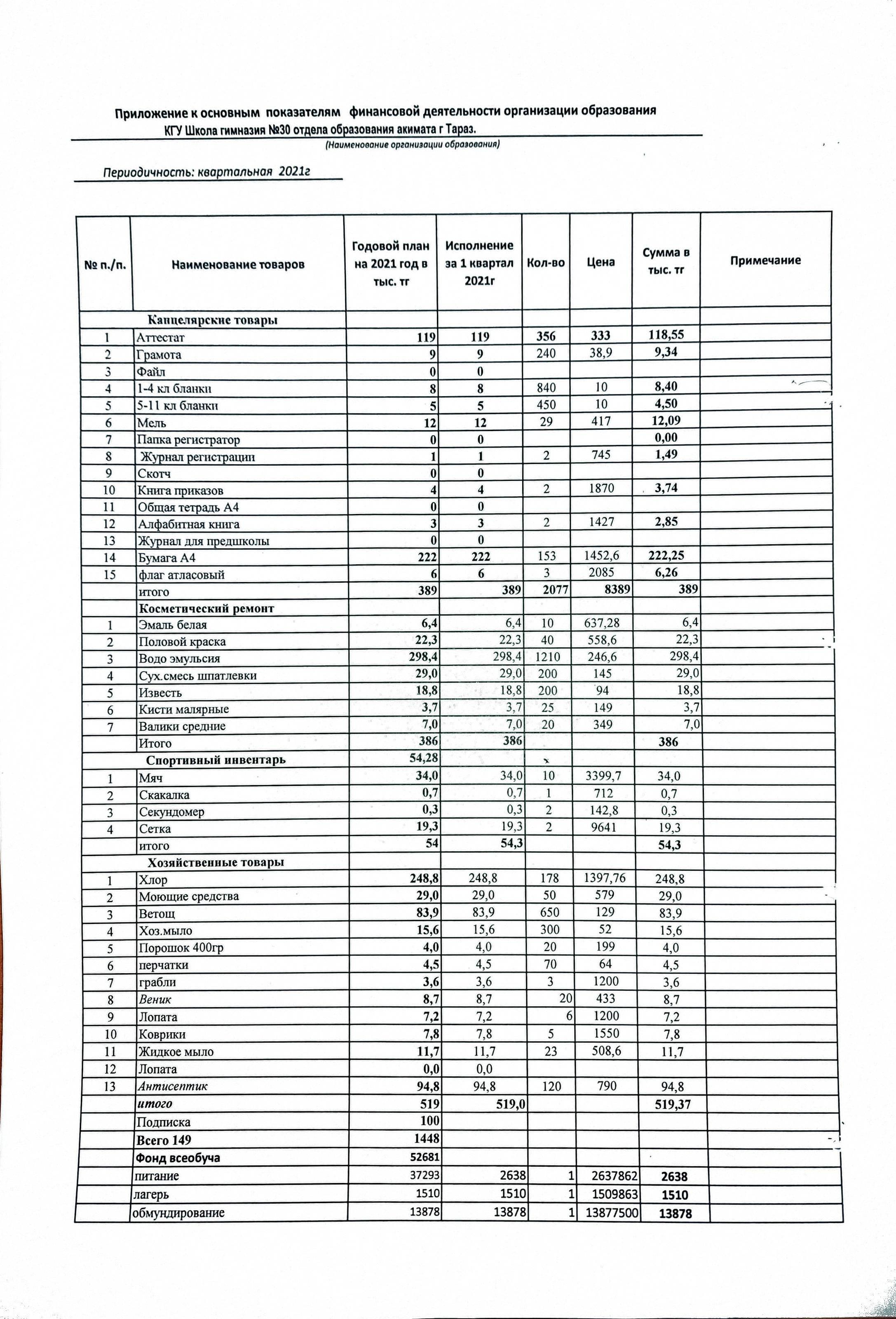 Қаржы қызметінің негізгі көрсеткіштері 2021 жылдың 1-қазаны » №30 мектеп-гимназия