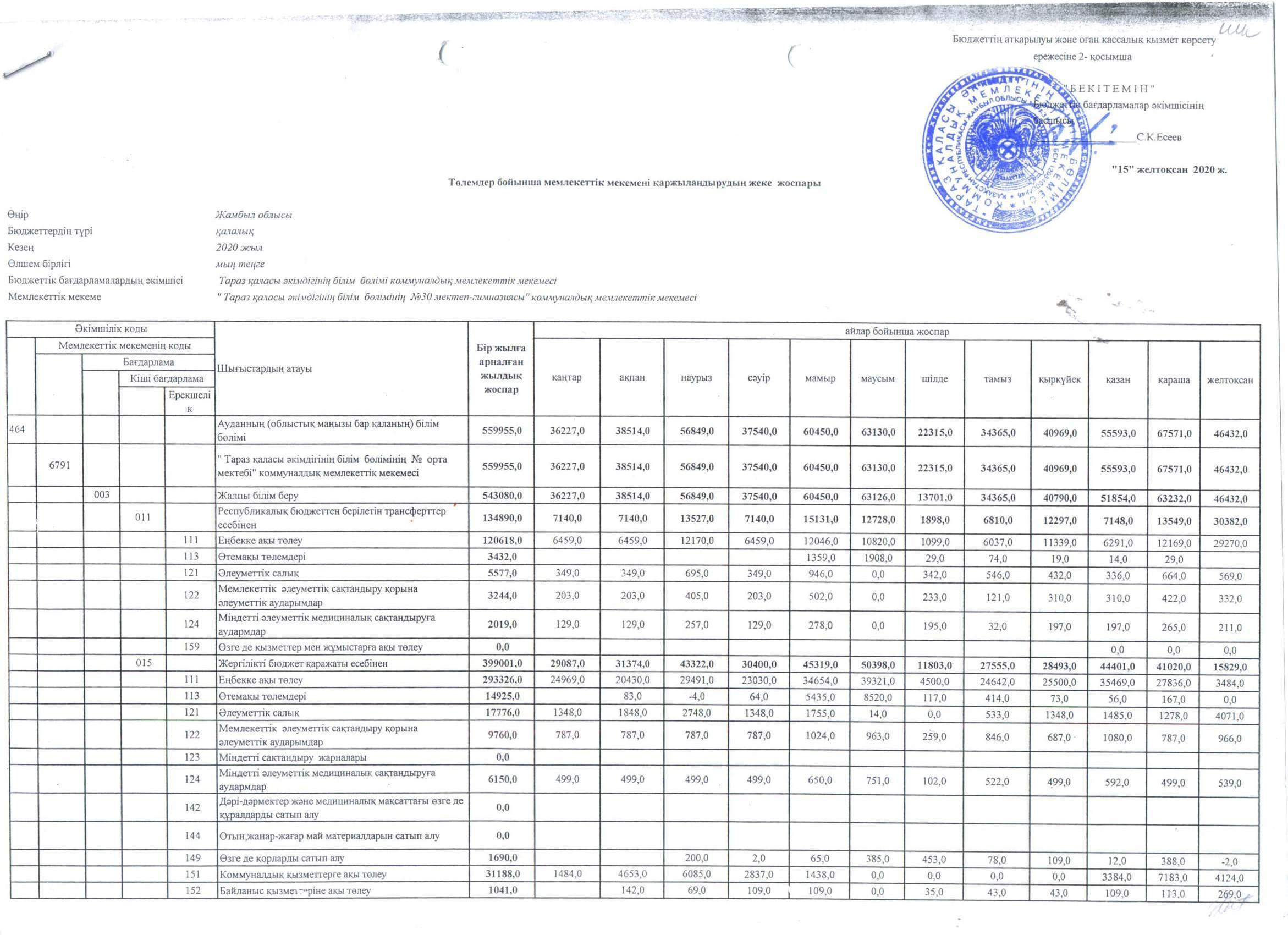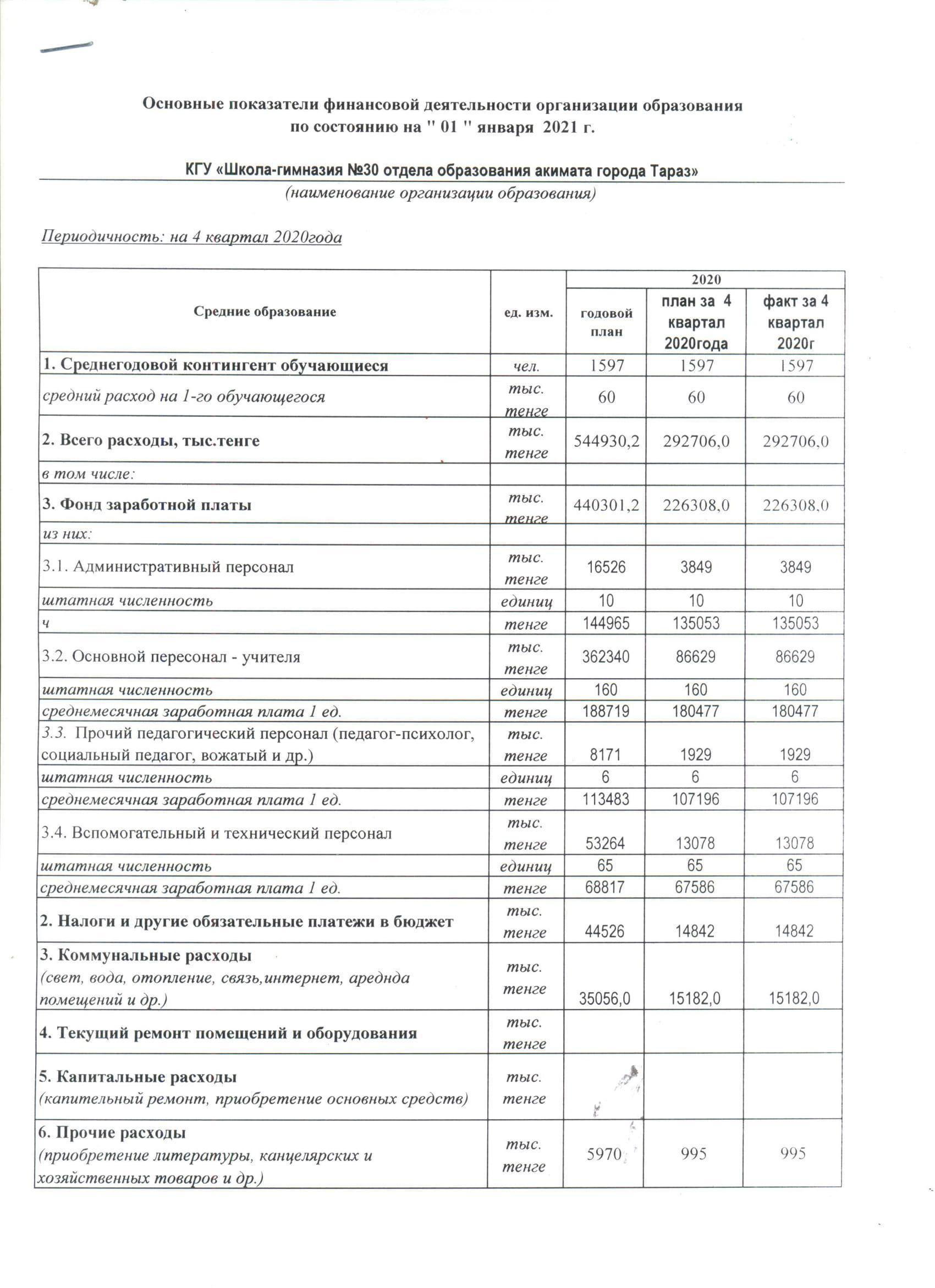 Қаржы қызметінің негізгі көрсеткіштері 2021 жылдың 1-қаңтарына » №30 мектеп-гимназия