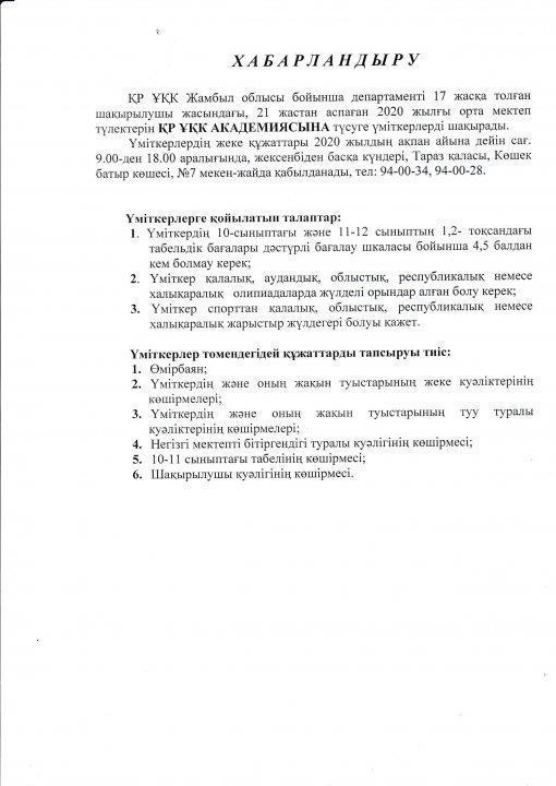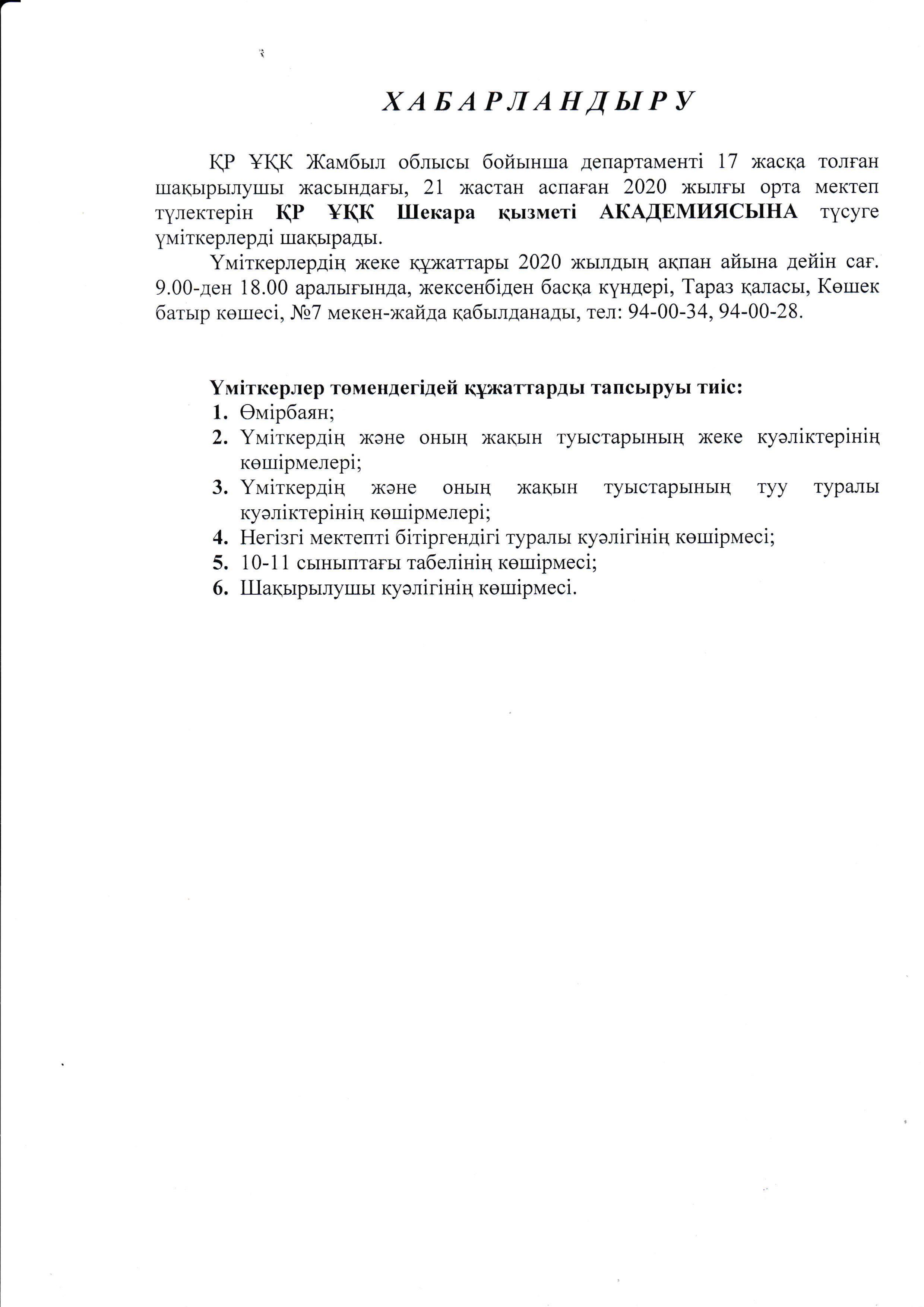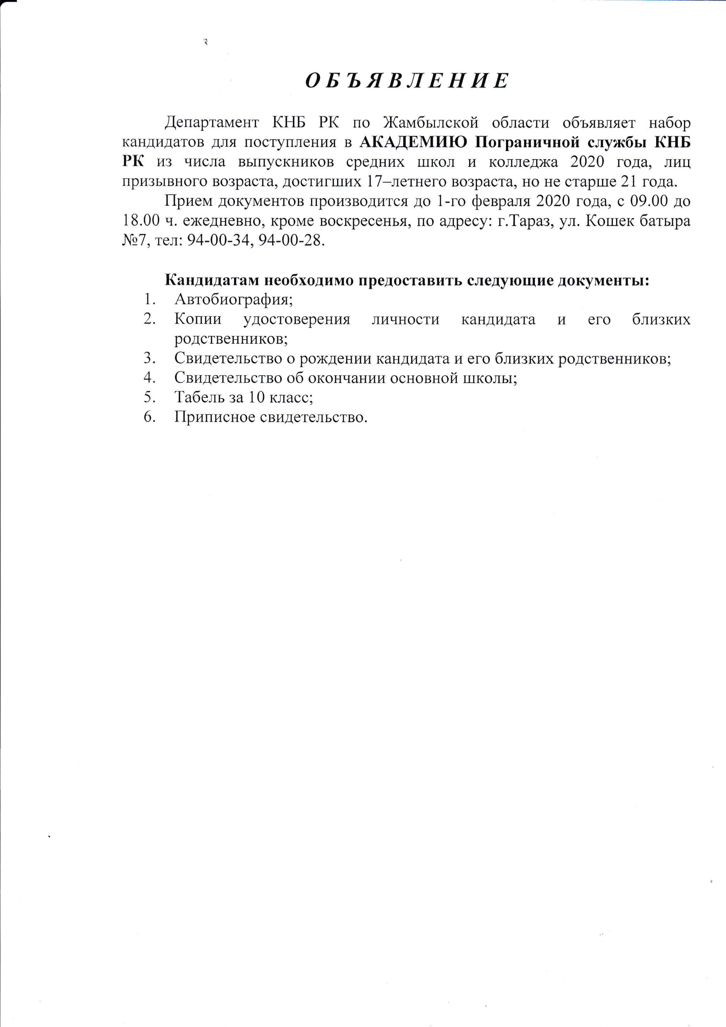 №30 мектеп-гимназия » Ақпарат » Қазақстан Республикасының Ұлттық қауіпсіздік комитетінің Шекара қызметі Академиясына және ҚР ҰҚК Академиясына түсуге үміткерлерді шақыру