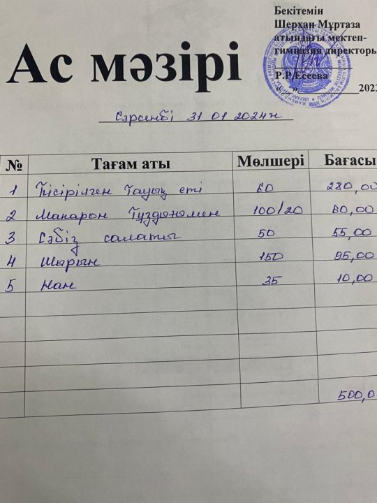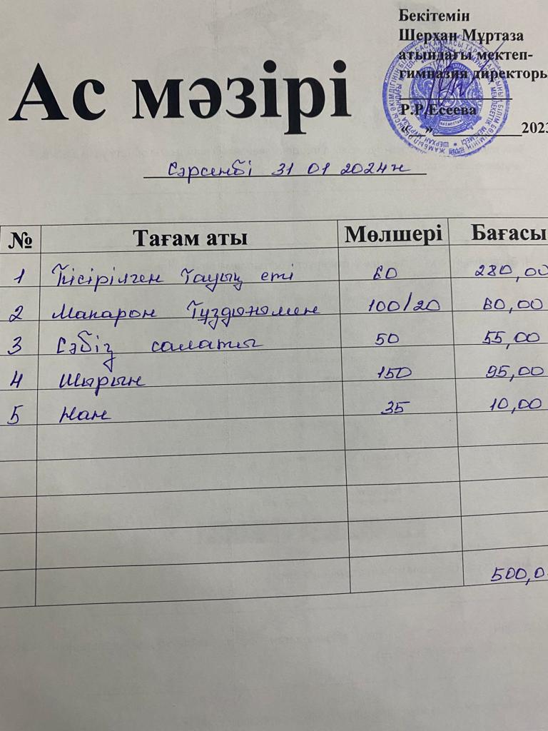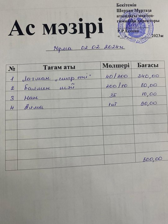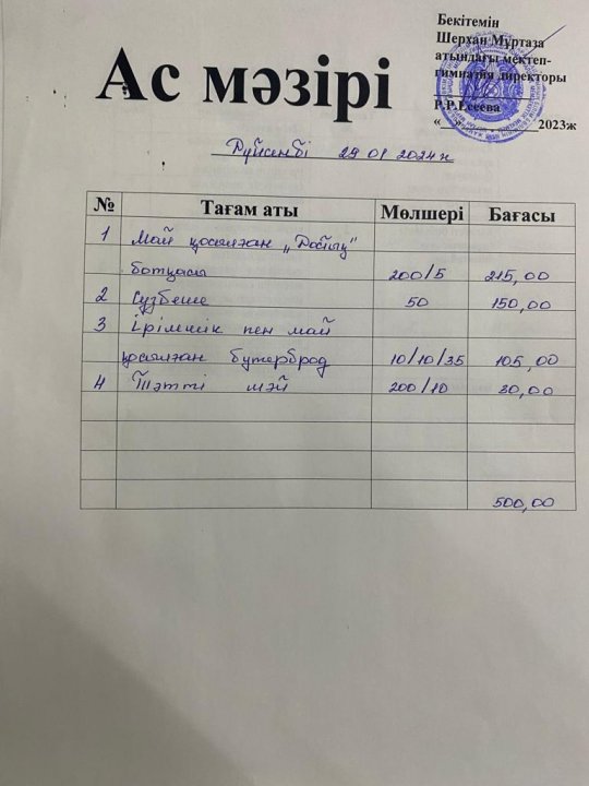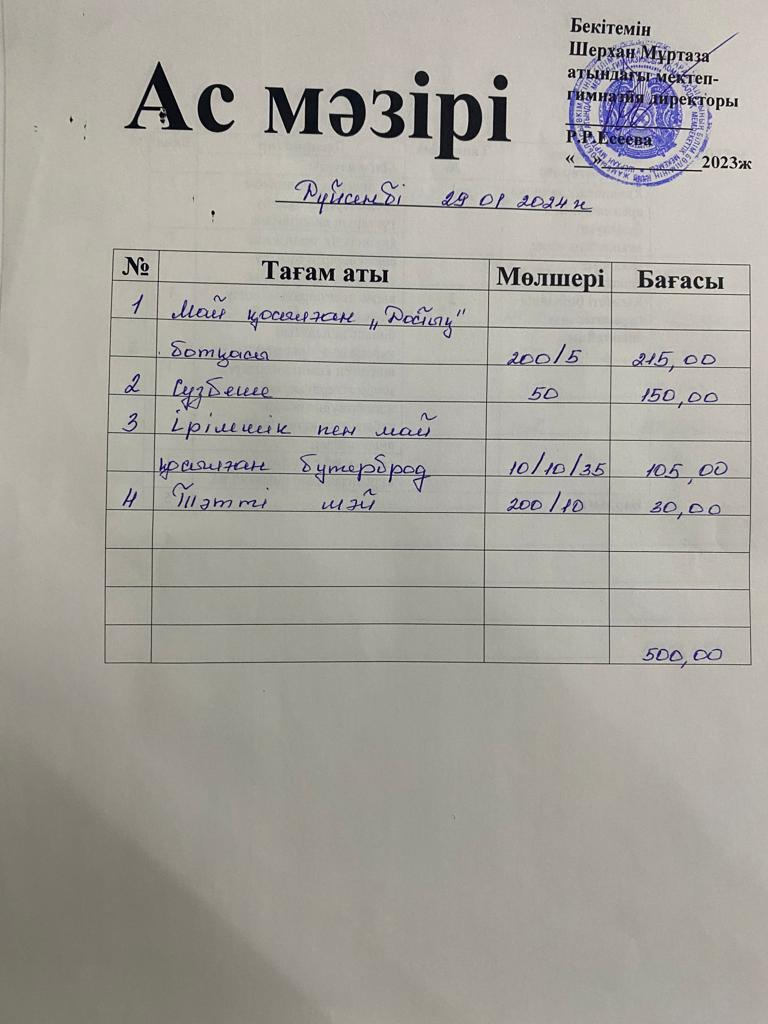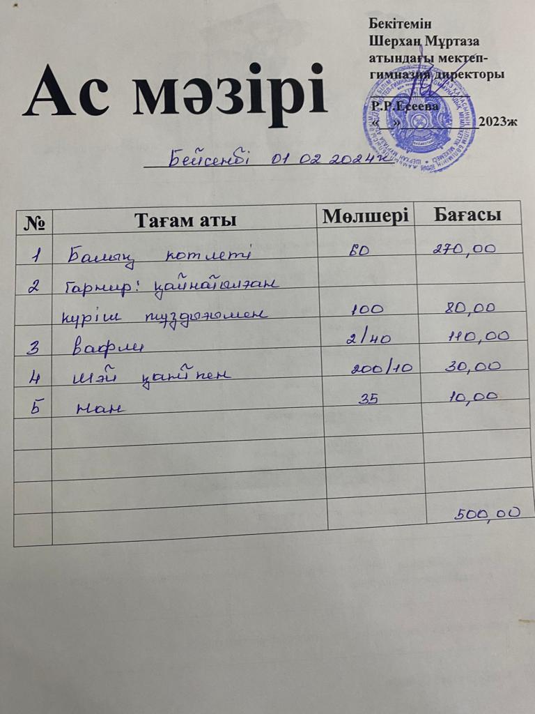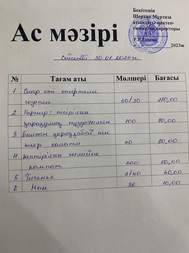 Мектеп меню 29 қаңтар - 02 ақпан