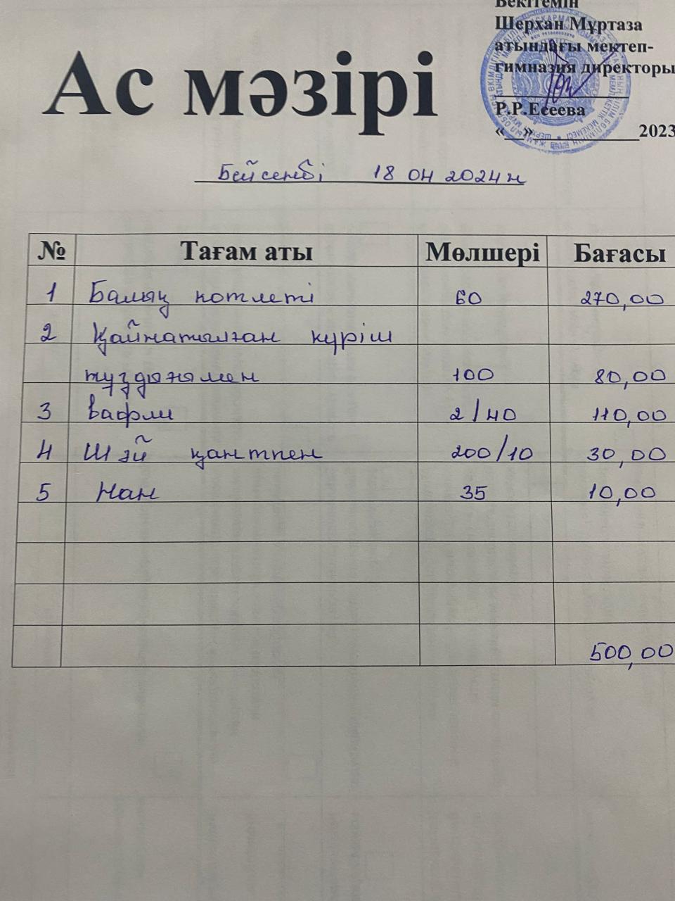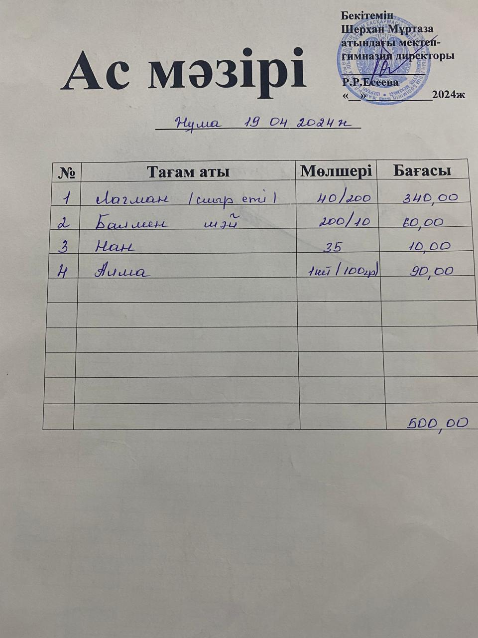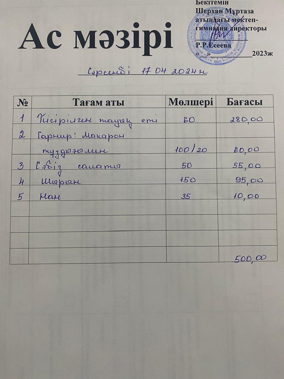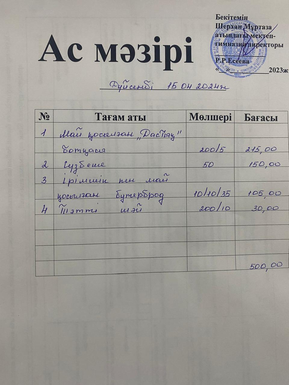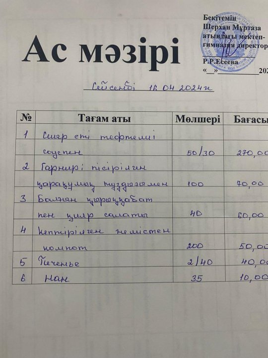 Мектеп меню 15-19 сәуір