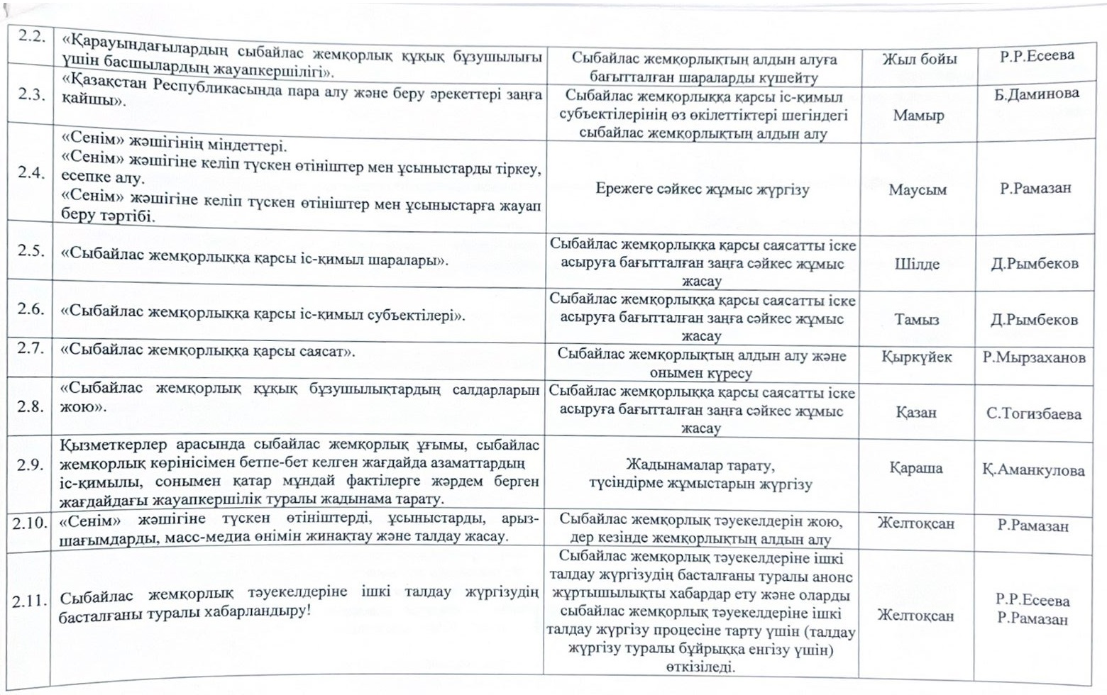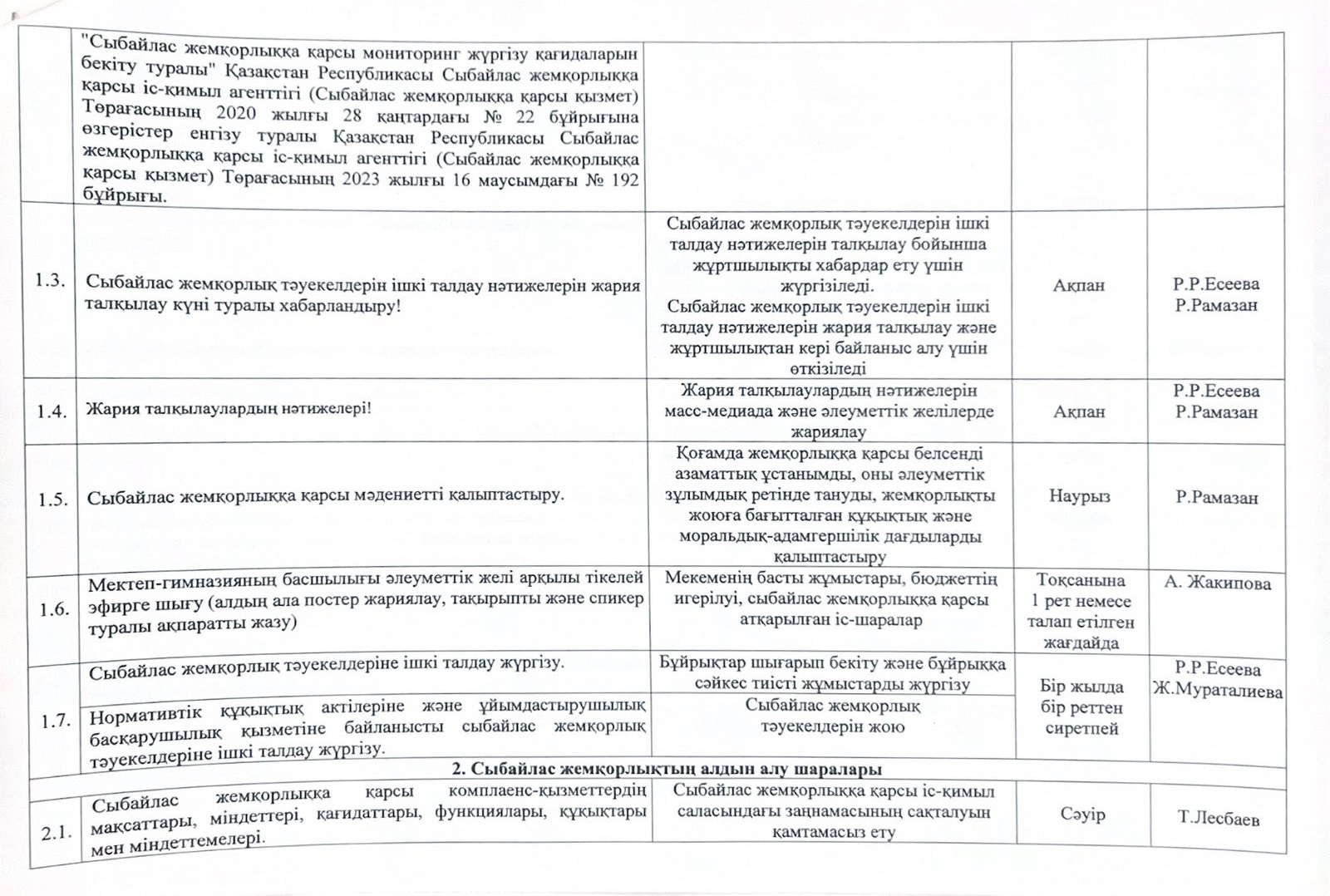 05 январь 2026 0 1 2 3 4 5 Сыбайлас жемқорлыққа қарсы іс-қимыл саласындағы қатынастарды реттеуге арналған жұмыс жоспары