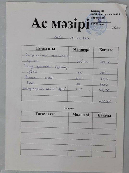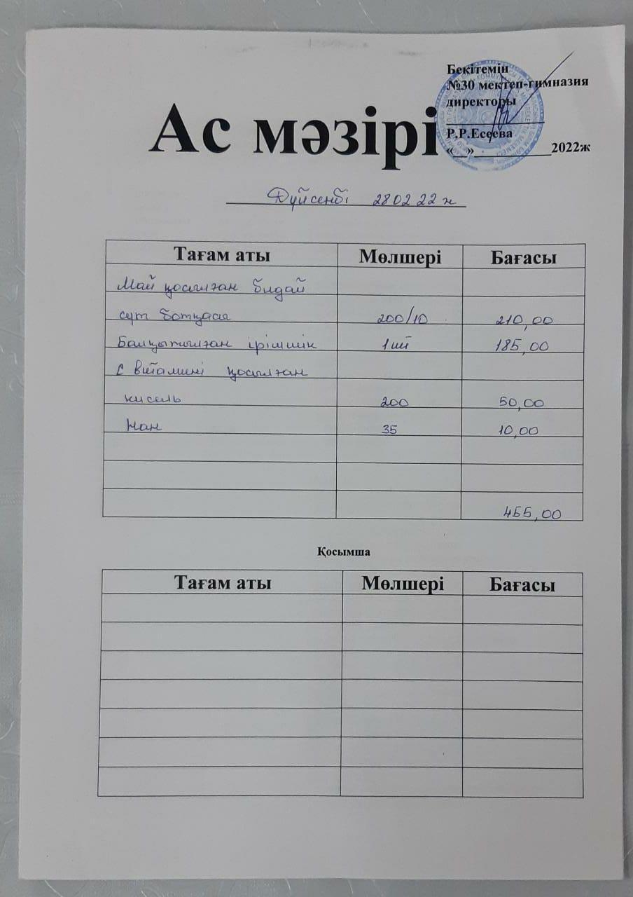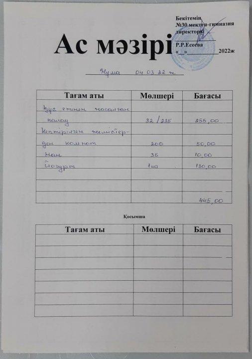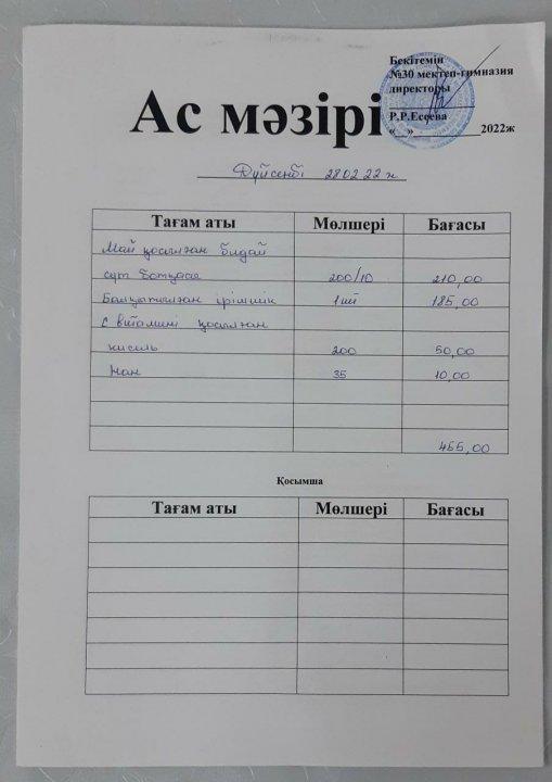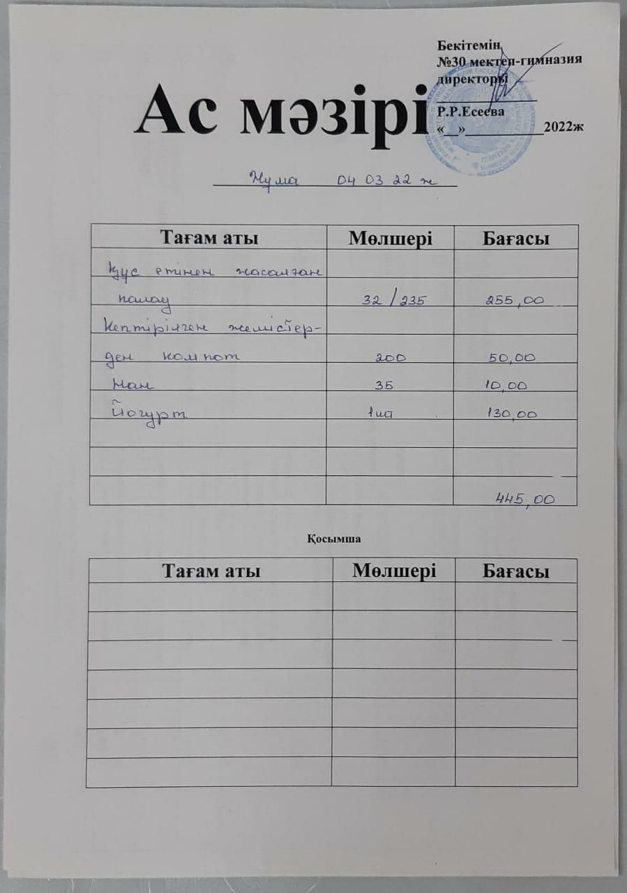 28 ақпан - 5 наурыз аралығындағы ас мәзірі » №30 мектеп-гимназия