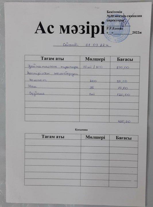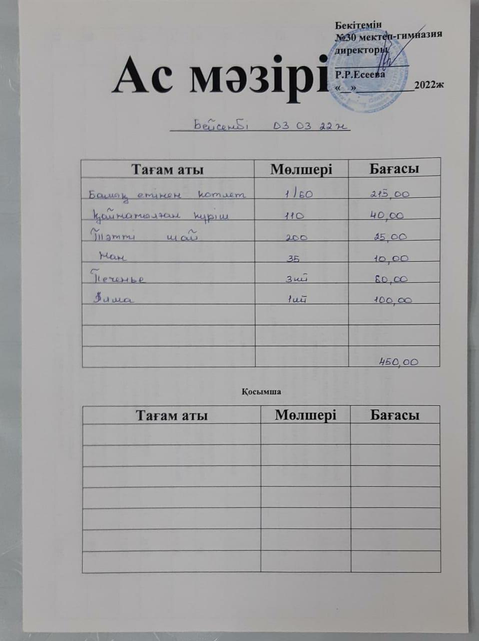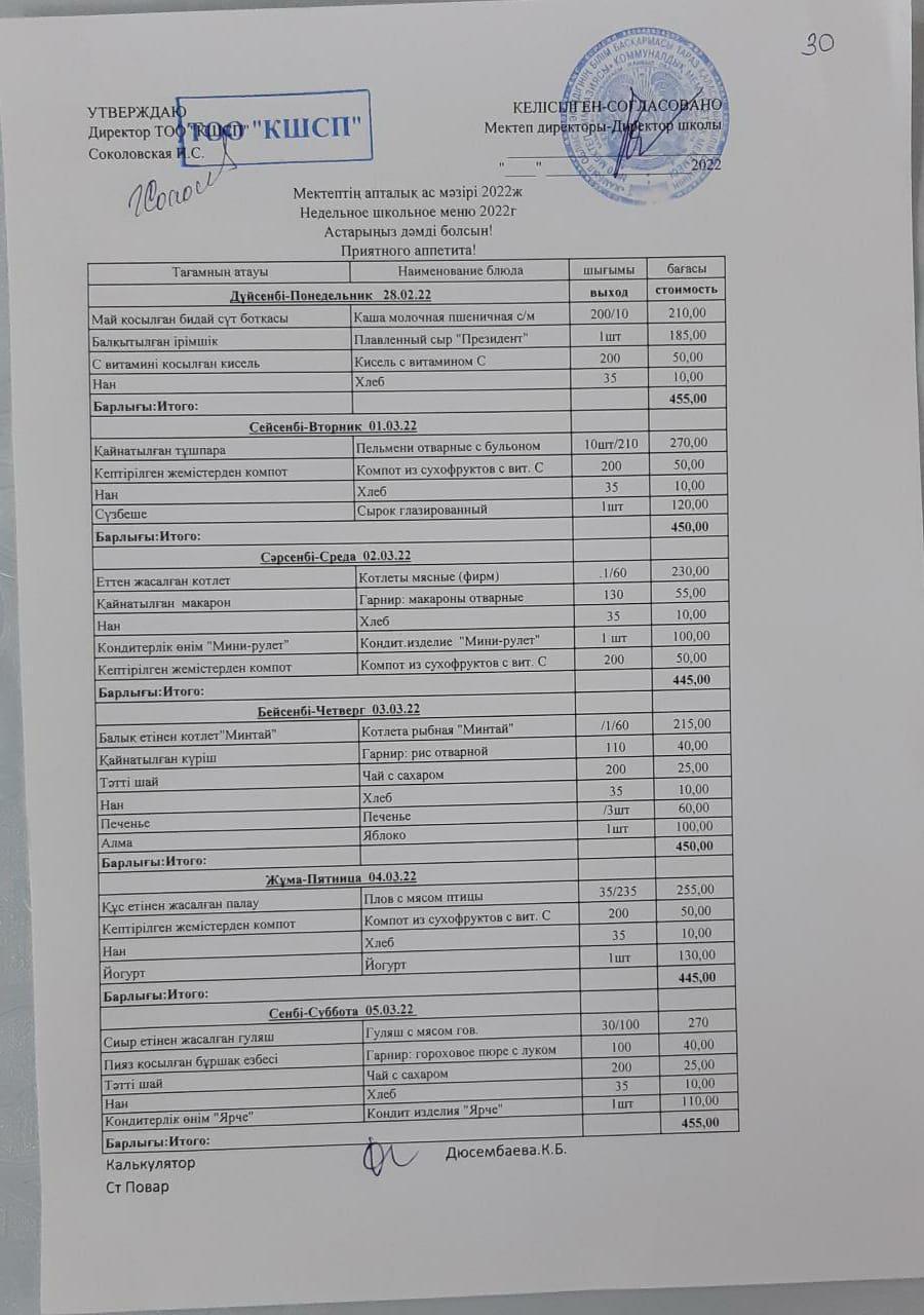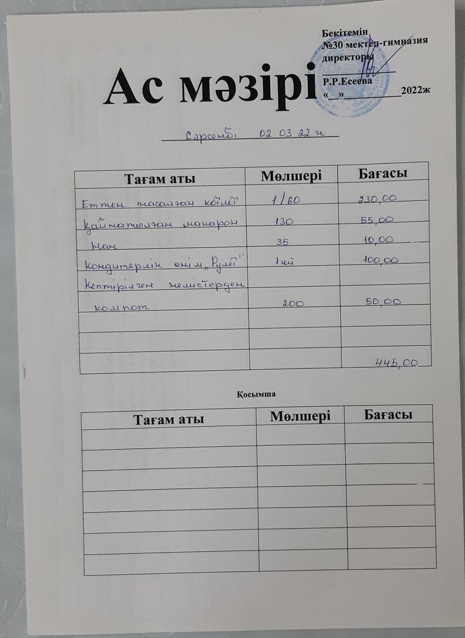 28 ақпан - 5 наурыз аралығындағы ас мәзірі » №30 мектеп-гимназия